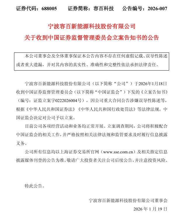 同日,容百科技發(fā)布關(guān)于收到證監(jiān)會立案告知書的公告。